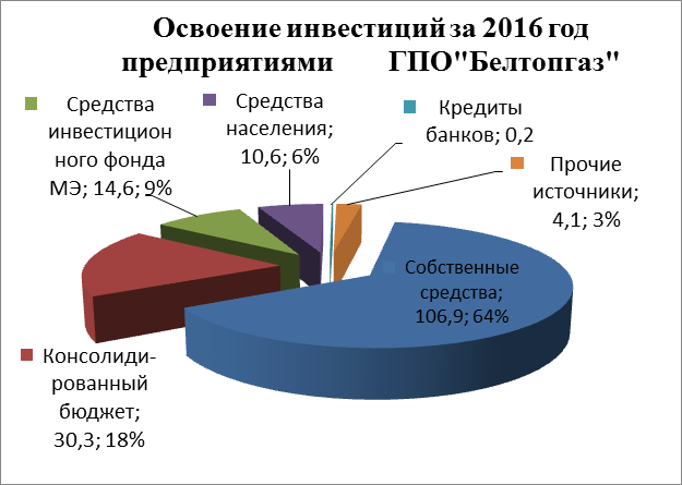 В 2016 году организации ГПО «Белтопгаз» направили на инвестиции в основной капитал 166,7 млн. (здесь и далее –деноминированных) рублей. Прогнозируемый на год объем капиталовложений превышен на 9,9 процентных пункта (или на 15 млн. рублей) за счет мобилизации организациями объединения собственных средств и дополнительного выделения средств республиканского и местных бюджетов.