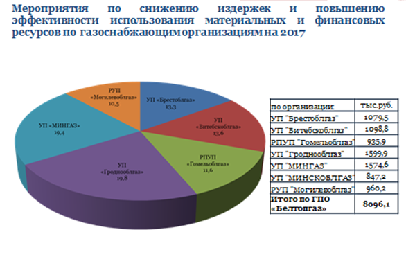 В ходе заседания отмечено, что в целом по ГПО «Белтопгаз» экономический эффект от реализации мероприятий в 2017 году запланирован в сумме более 11,7 млн. рублей. Большая часть эффекта – около 8,1 млн. рублей – планируется получить от внедрения мероприятий на объектах газоснабжения.
