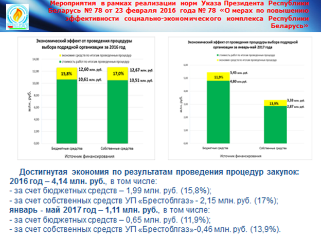 Работа с персоналом над принципами и подходами, заложенными в Указе № 78, не ослабла. В 2017 году предприятием подготовлено и успешно реализуется мероприятий на сумму более 1,079 млн. руб. За пять месяцев 2017 г. снижение издержек по УП «Брестоблгаз» составило почти 200 тыс. рублей или 103,2 процента к запланированному на этот период.