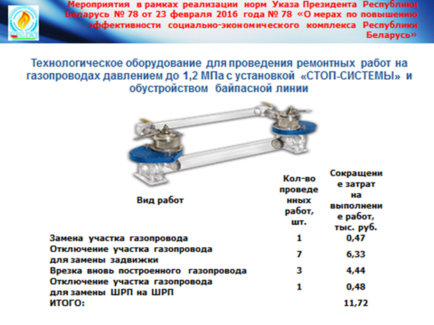 - сокращения потерь природного газа при выполнении работ по присоединению газопроводов методом холодной врезки и проведения работ по замене запорных устройств на наружных газопроводах без отключения потребителей при помощи спецоборудования;