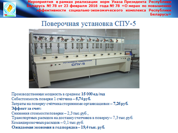 На предприятии создано 3 новых рабочих места за счет ввода эксплуатацию установки поверки бытовых приборов учета газа. От внедрения этого мероприятия предполагается снижение затрат на поверку счетчиков за счет сокращения транспортных расходов и сокращение издержек за счет выполнения работ собственными силами. Экономический эффект от внедрения мероприятия ожидается в сумме 19,4 млн. рублей в год.