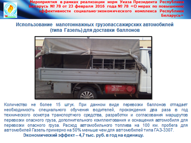 - постоянный пересмотр маршрутов доставки баллонов до потребителей, передача смежных районов доставки РГС с целью увеличения загрузки и сокращения пробега;