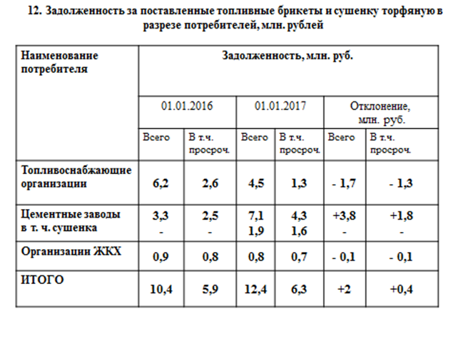 Основные должники – цементные заводы (7,1 млн. рублей, в том числе просроченная 4,3 млн. рублей) и топливоснабжающие организации (4,5 млн. рублей, в том числе просроченная 1,3 млн. рублей). При равных объемах поставки задолженность топливоснабжающих организаций на 2,6 млн. рублей меньше, чем у цементных заводов. Задолженность цементных заводов за поставленное торфяное топливо (торфобрикет, сушенка торфяная) возросла на 3,8 млн. рублей, в т. ч. просроченная на 1,8 млн. руб. Денежная форма расчетов цементными заводами за полученное на 23,8 млн. руб. торфяное топливо составила всего 12,6 % (3 млн. руб.), оплата продукцией цементных заводов – 51,7% (12,3 млн. руб.). Задолженность контрагентов по договорам перевода долга цементных заводов на 1.01.2017 года составила 5,8 млн. руб.