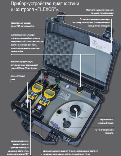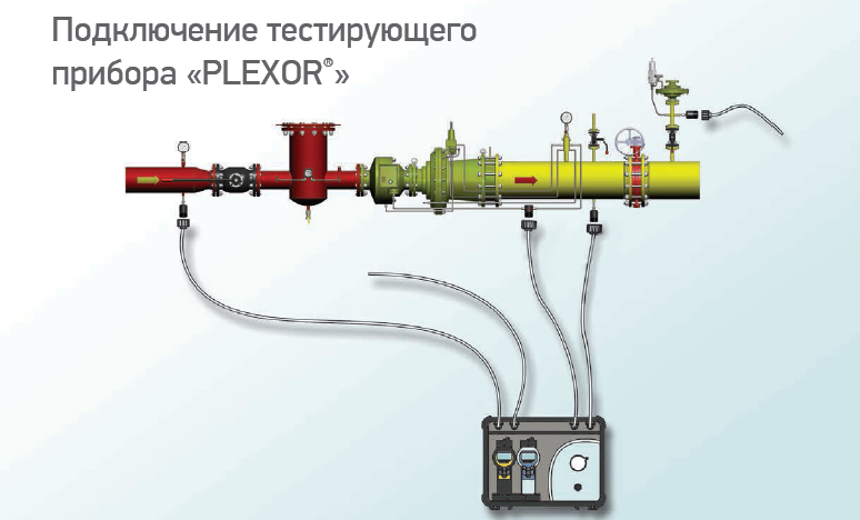 Для диагностики и контроля работы газорегуляторного пункта специалист подключает «PLEXOR®» к точкам проведения диагностики и измерения параметров в газорегуляторном пункте. Данные точки оснащены специальными стационарными штуцерами. Специалист быстро и легко подключает тестирующий прибор «PLEXOR®» к штуцерам с помощью гибких шлангов с накидными гайками и последовательно выполняет проверку в соответствии с установленным порядком с помощью программного обеспечения «CONNEXION®». Порядок осуществления контроля внесен в программные модули и полностью соответствует регламенту газоснабжающих организаций и техническим характеристикам соответствующего газорегуляторного пункта. Результаты диагностики и контроля по протоколу беспроводной связи автоматически отправляются на КПК или PC ноутбук.