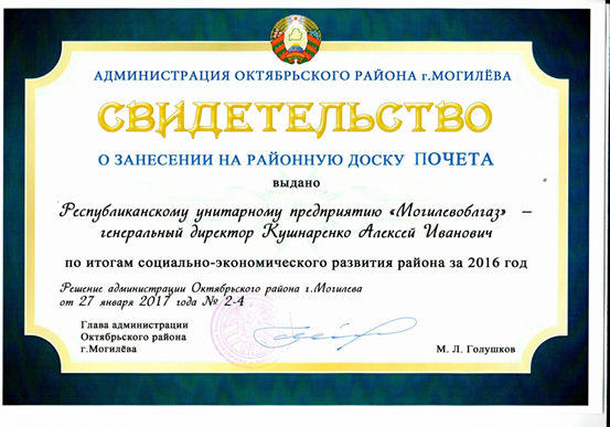 По итогам социально-экономического развития Октябрьского района г. Могилева за 2016 год РУП «Могилевоблгаз» было вручено свидетельство о занесении на районную доску почета.