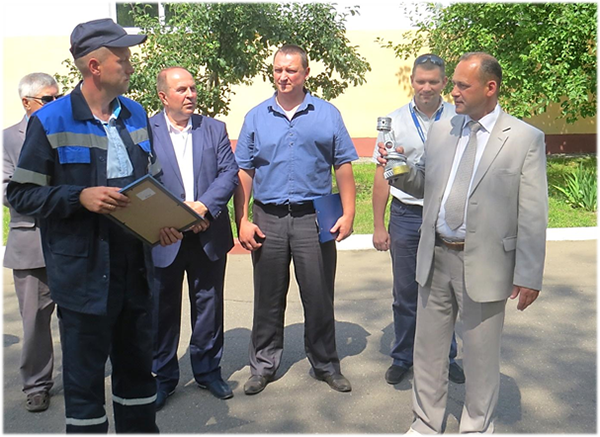 Главный инженер РПУП «Гомельоблгаз» Виталий Прежин вручает приз лидеру команды-победителя