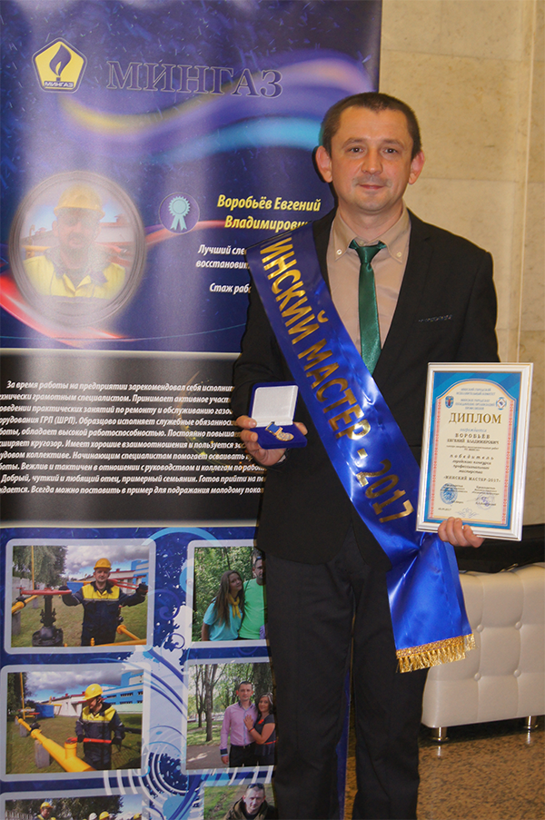 От УП «МИНГАЗ» на звание Минский мастер был выдвинут победитель конкурса «Лучший слесарь службы аварийно-восстановительных работ - 2017 года» Воробьев Евгений Владимирович, который был награжден почетным знаком «Минский мастер» и памятным призом - телевизор «Horizont».